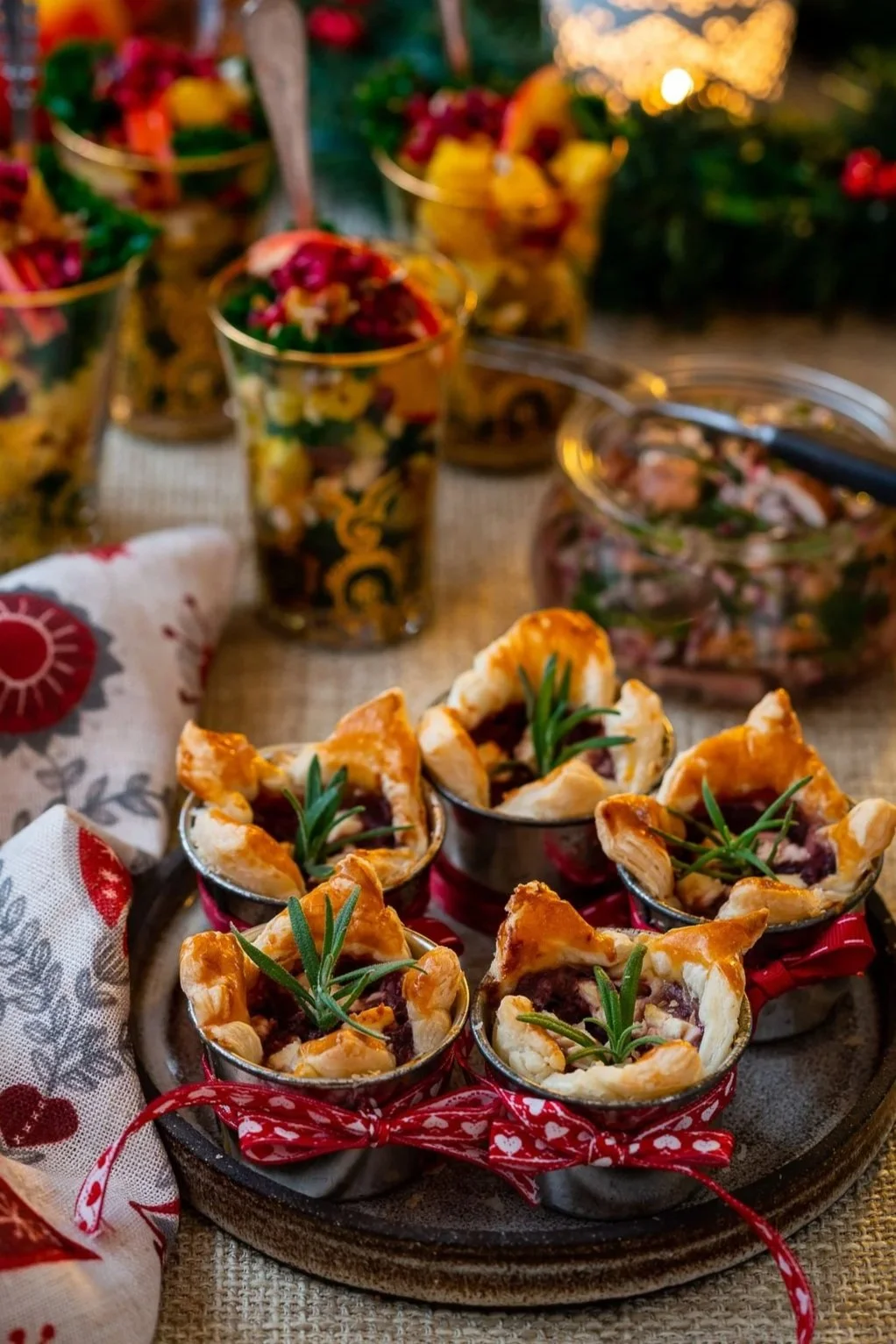 Sätt ugnen på 175 grader. Klä tartelettformar med smördeg. Kör rödkål, fetaost, ägg, grädde och rosmarin i en matberedare.