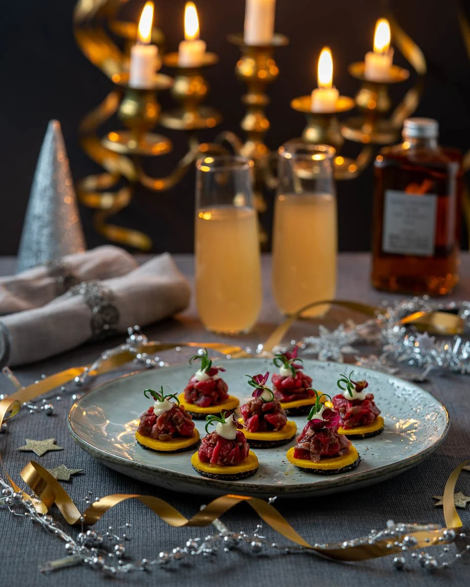 Oxfilé blir otroligt mör när den gravas i whisky. Görs dessutom ett par dagar före festen och klarar sig själv i kylen. Du kan även smaksätta majonnäsen med whisky, getost eller tryffel för ännu mer smak. En rätt med hög impafaktor!